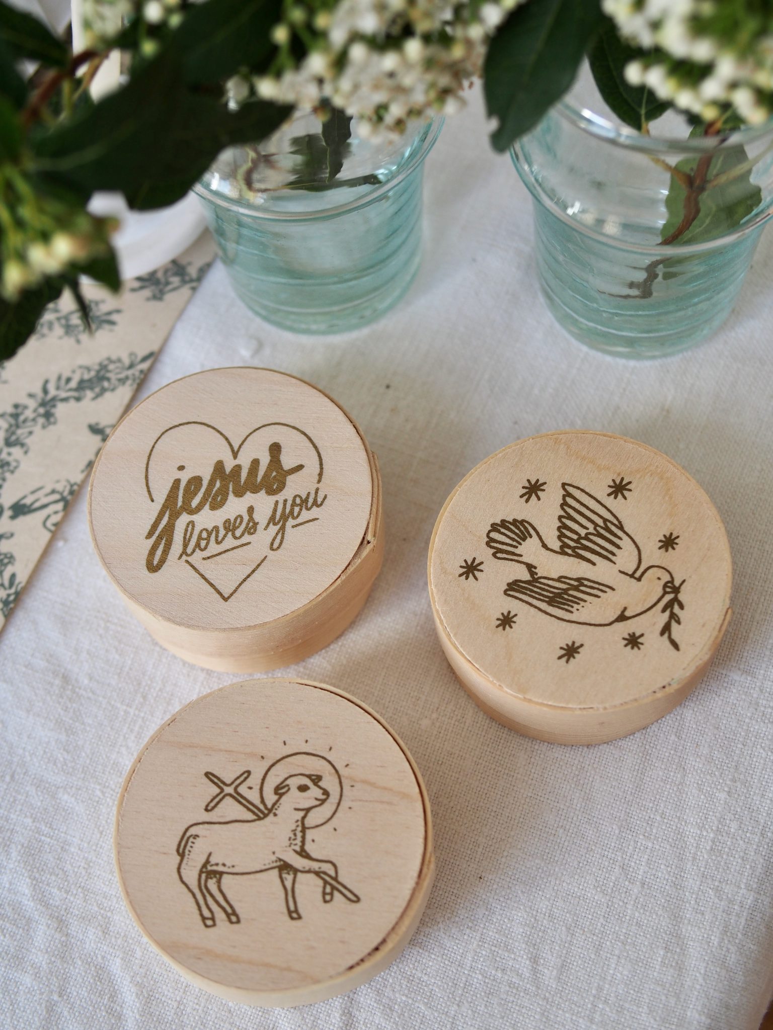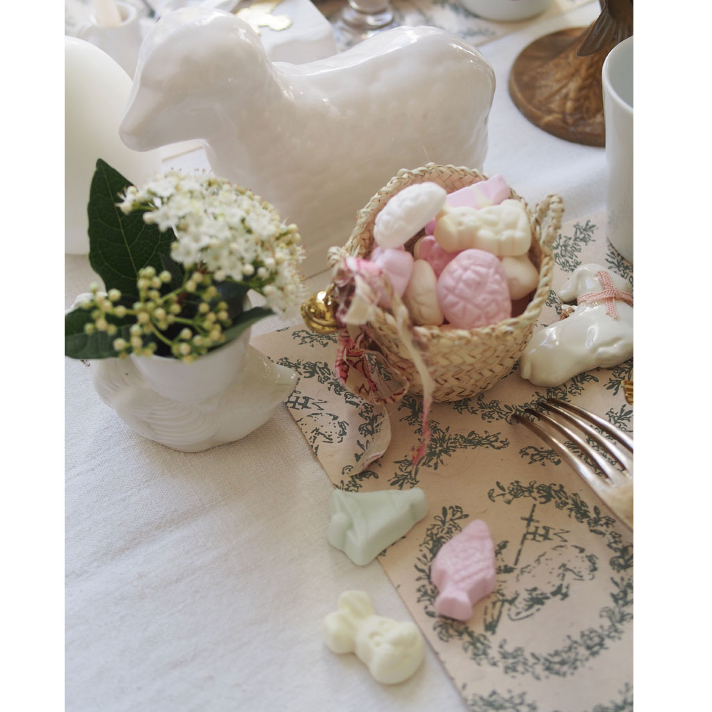 Ici nos jolis sets de table Agneau de Dieu et nos boîtes gigognes à garnir !