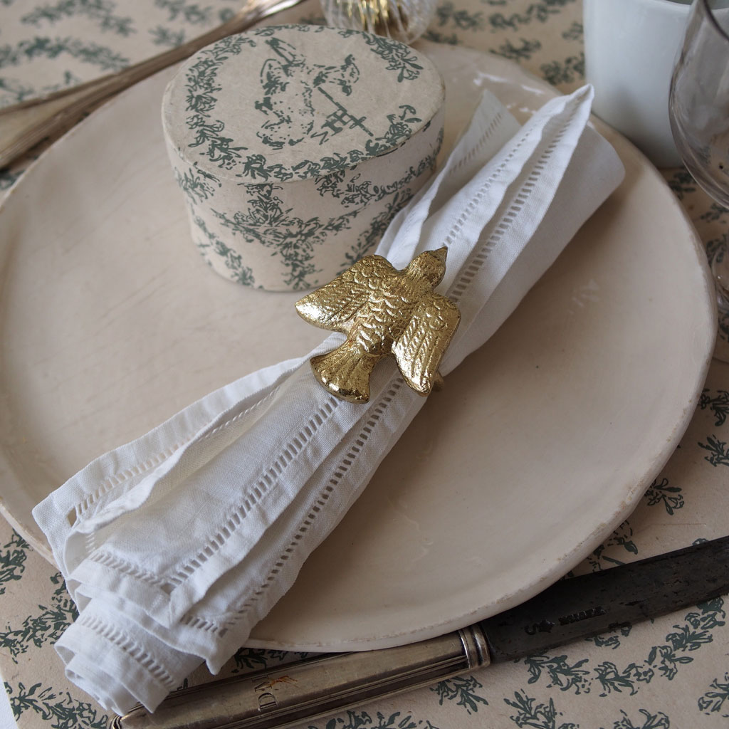 Un rond de serviette doré en forme de colombe qui se marie à merveille avec les couverts chinés !