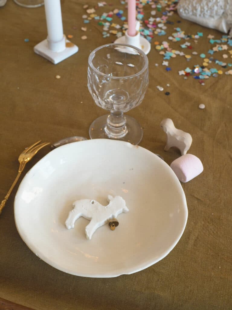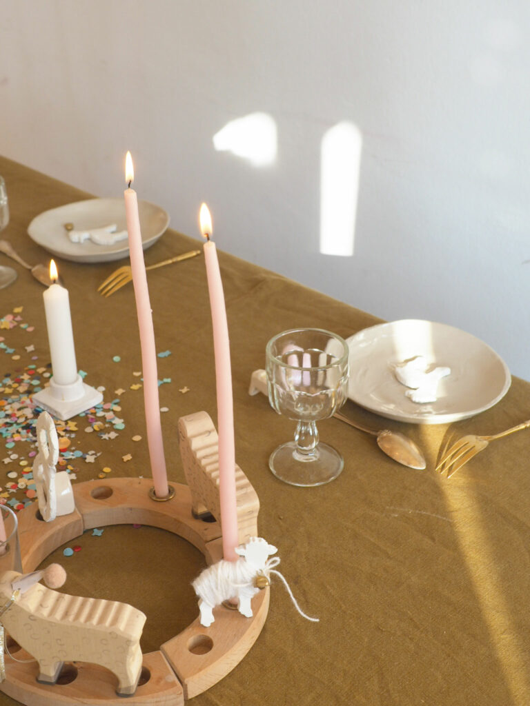 Pour l’anniversaire de Blanche, nous avions choisi le thème de l’agneau. La symbolique de l’agneau de Dieu, est superbe pour un baptême aussi ou une communion. J’ai réalisé un atelier DIY qui nous a ensuite servi comme déco de table !